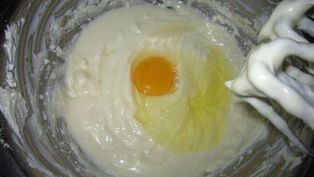 2.分三次加入 全蛋2顆, 和蛋黃1顆,打勻