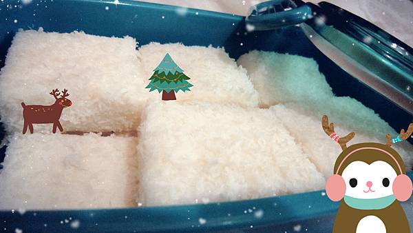 將切塊的雪花糕每一面都沾上椰子粉就完成囉!